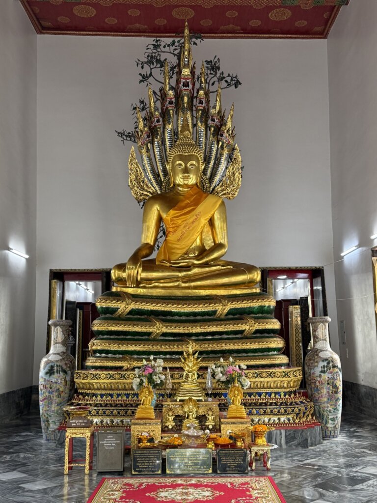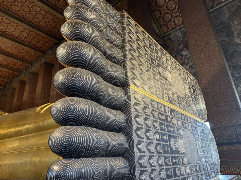 Today, Wat Pho is most famous for housing the magnificent Reclining Buddha, a colossal statue measuring 46 meters long and 15 meters high. This stunning figure, covered in gold leaf, depicts the Buddha in a serene, reclining position, symbolising his entry into Nirvana and liberation from the cycle of rebirth. The statue’s feet are particularly striking, inlaid with mother-of-pearl displaying 108 auspicious symbols, a sacred number in Buddhism believed to represent the number of earthly desires one must overcome to reach enlightenment. As a small experiment you can throw coins into 108 pots and try to count them correctly. The quiet hum of monks chanting prayers within the temple adds to the profound spiritual atmosphere, resonating through the ancient halls.