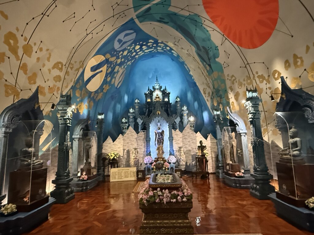 The uppermost level inside the elephant’s belly epitomises the heavenly realm and houses some of the museum’s most revered items such as ancient Buddha relics and statues from several important Thai historical eras, like Lopburi and Ayutthaya. This space feels ethereal, with the walls adorned in intricate blue and gold décor following the elephant’s curves, creating a celestial chapel atmosphere. The crown jewel inside is the breathtaking stained-glass dome, vividly coloured and depicting a cosmic map alongside the twelve zodiac signs, a sight that often mesmerises visitors.