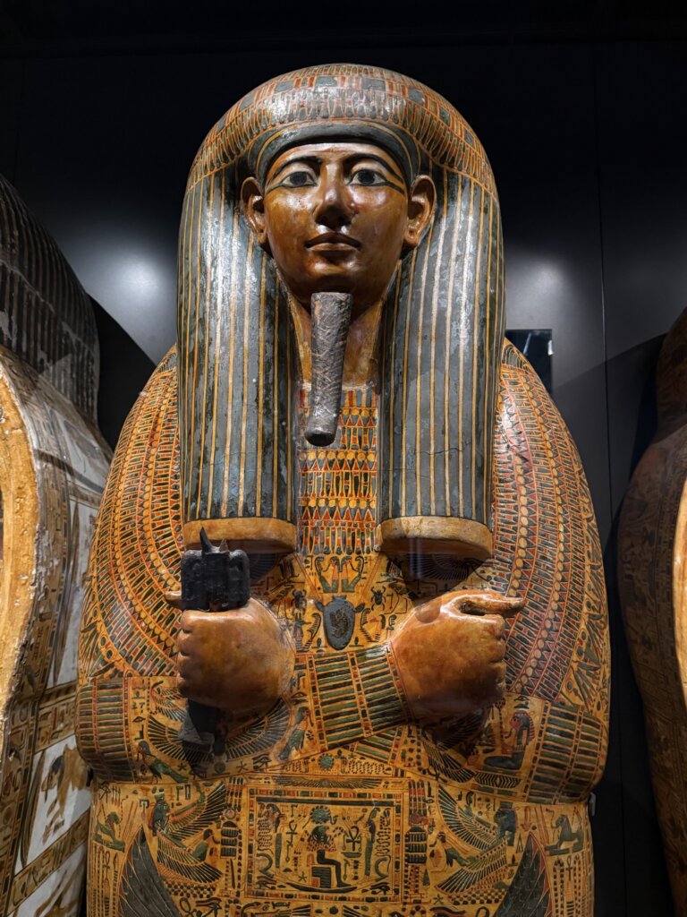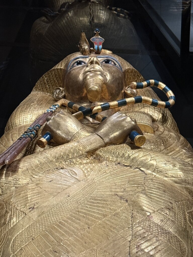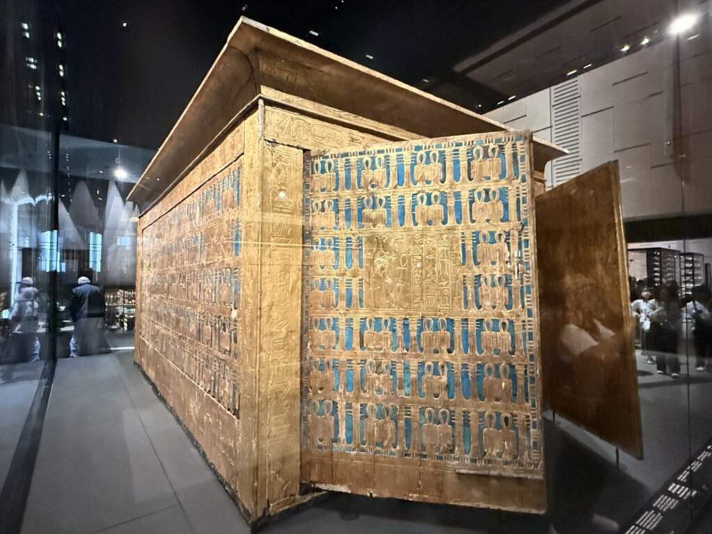 The exhibits are awe-inspiring in their scale and detail, most notably the four nested, gilded wooden shrines that once enclosed the king’s sarcophagus and coffins. Within these, three coffins – two crafted from wood and gold leaf and the innermost forged from solid gold – were arranged like Russian dolls. The iconic golden mask, a masterwork of ancient craftsmanship, was placed directly over the king’s face and shoulders, with its radiant gold inlaid with lapis lazuli, turquoise, and coloured glass. Together with hundreds of shawabtis, canopic shrines, ritual beds, chariots, musical instruments, and personal items, the collection illustrates the belief in provisioning the ruler for the afterlife in every conceivable way.