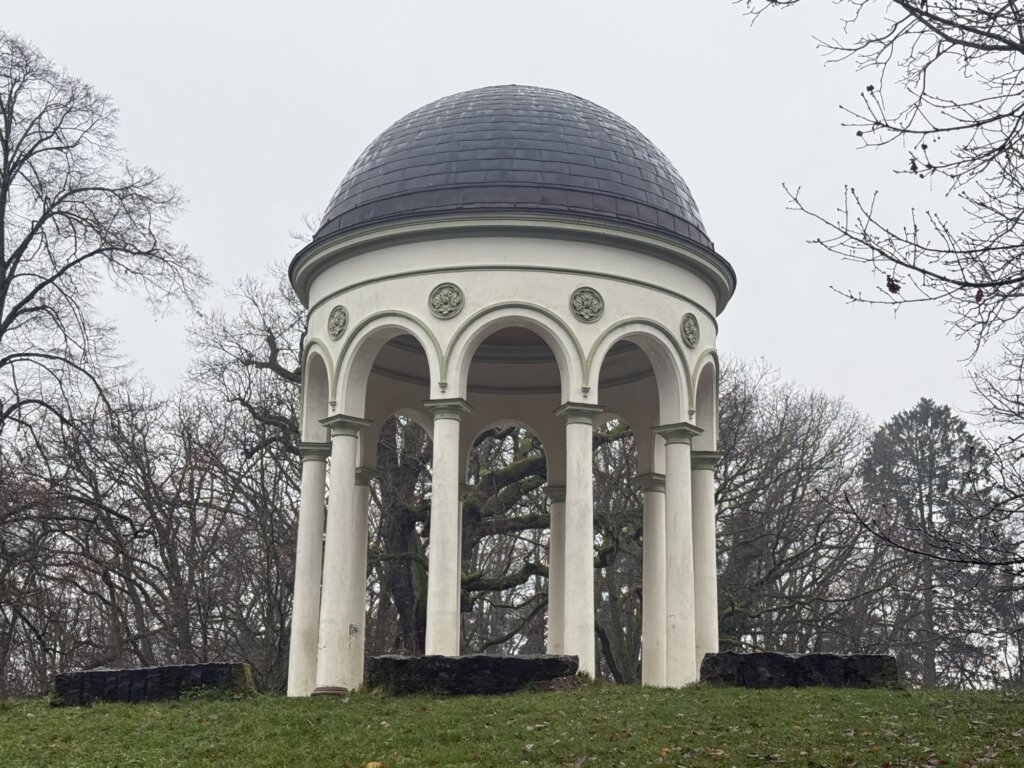 At the heart of this carefully staged landscape stands the Neroberg-Tempel, a small, open, circular temple that acts as both an architectural ornament and a viewing platform. Built in the nineteenth century in the style of an Italian Renaissance monopteros, it consists of a ring of columns supporting a domed roof, open to the air so that the actual ‘walls’ are the surrounding treetops and the distant cityscape. Because of its position on the edge of the slope, the temple feels like a balcony above Wiesbaden, and it has become a popular backdrop for wedding photos, quiet picnics and those contemplative pauses that naturally occur at the turning point of a walk.
