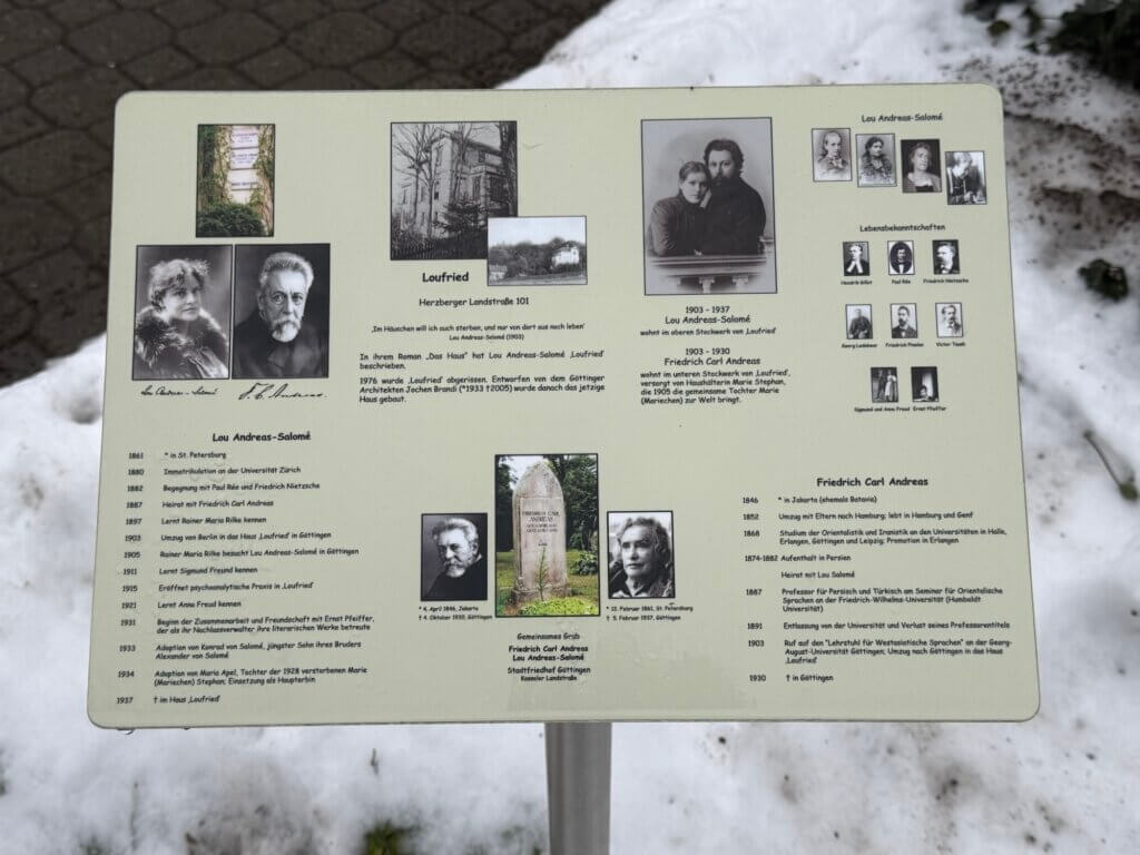 Her marriage to Friedrich Carl Andreas, concluded in 1887, brought her eventually to Göttingen, where he held a chair as philologist and where they shared a household that was more intellectual partnership and cohabitation than conventional romance. The house they lived in on the Hainberg above the town was later known as ‘Loufried’, a name that has survived the building itself, which was demolished in the 1970s but still lives on in local memory. Today, Göttingen remembers her through her grave on the Stadtfriedhof, a path named Lou-Andreas-Salomé-Weg, and the Lou Andreas‑Salomé‑Institut für Psychoanalyse und Psychotherapie, which anchors her legacy in the city’s present‑day therapeutic and cultural life.